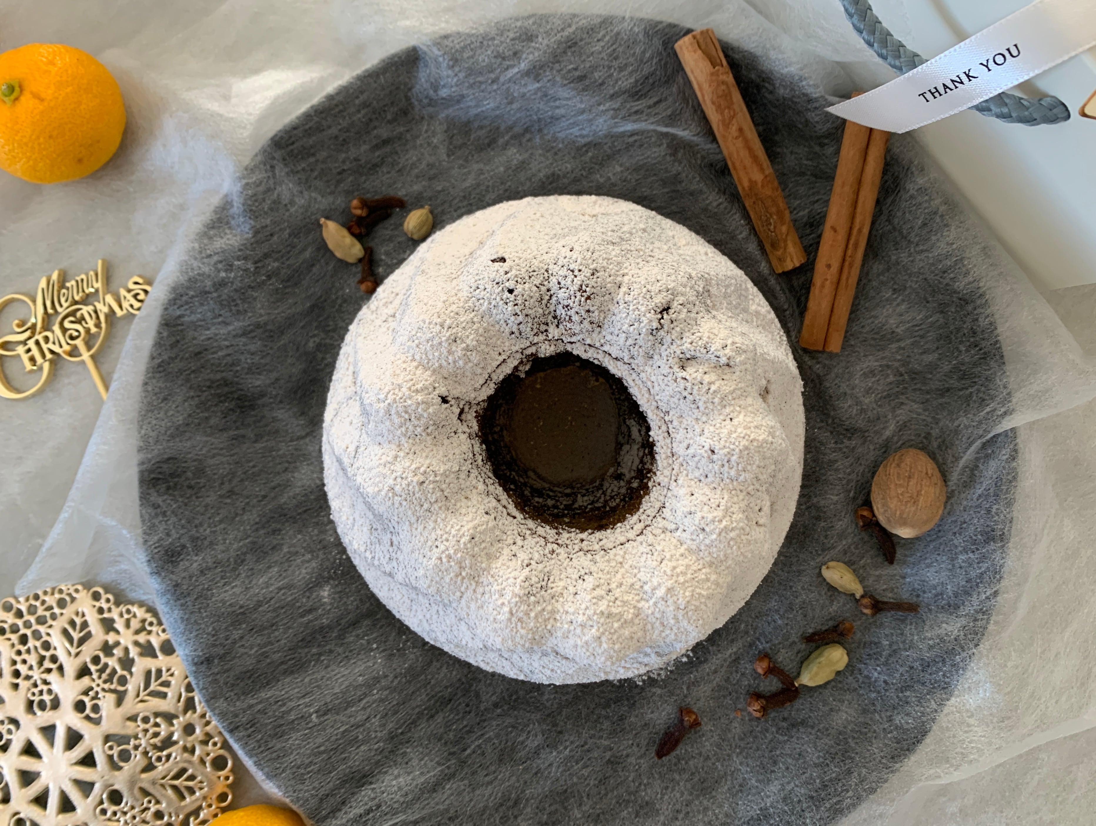 フランスのアルザス地方のXmas菓子。マリーアントワネットがこよなく愛した事でも知られてます。今年はバターとスパイシーチャイ風味のリッチな生地に柚子リキュール漬けドライフルーツ(林檎、赤ルバーブ、柚子、クランベリー、レーズン)をたっぷり混ぜ、波打つラインが特徴的なクグロフ型で焼き上げました。温かいうちに紅茶リキュール、柚子のシロップを打ち、スパイス香る粉糖をまぶしてシュトレン風な仕上げに。しっとりクグロフとスパイシーシュトレンの良いとこどりのオリジナルXmas菓子です♪