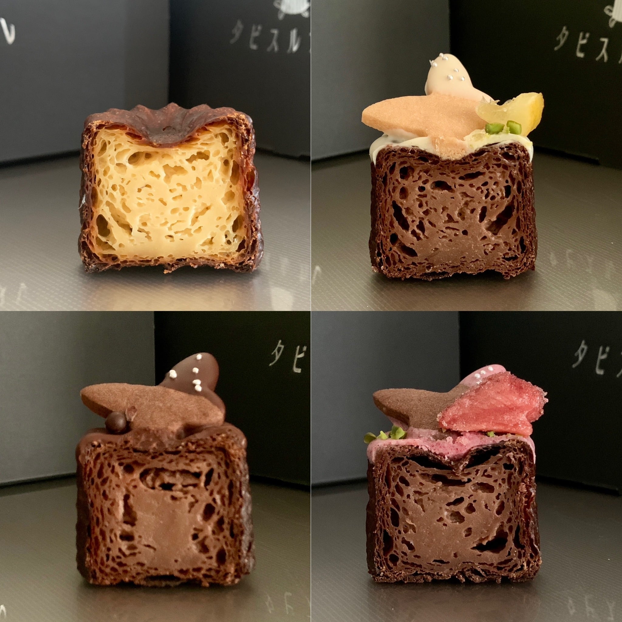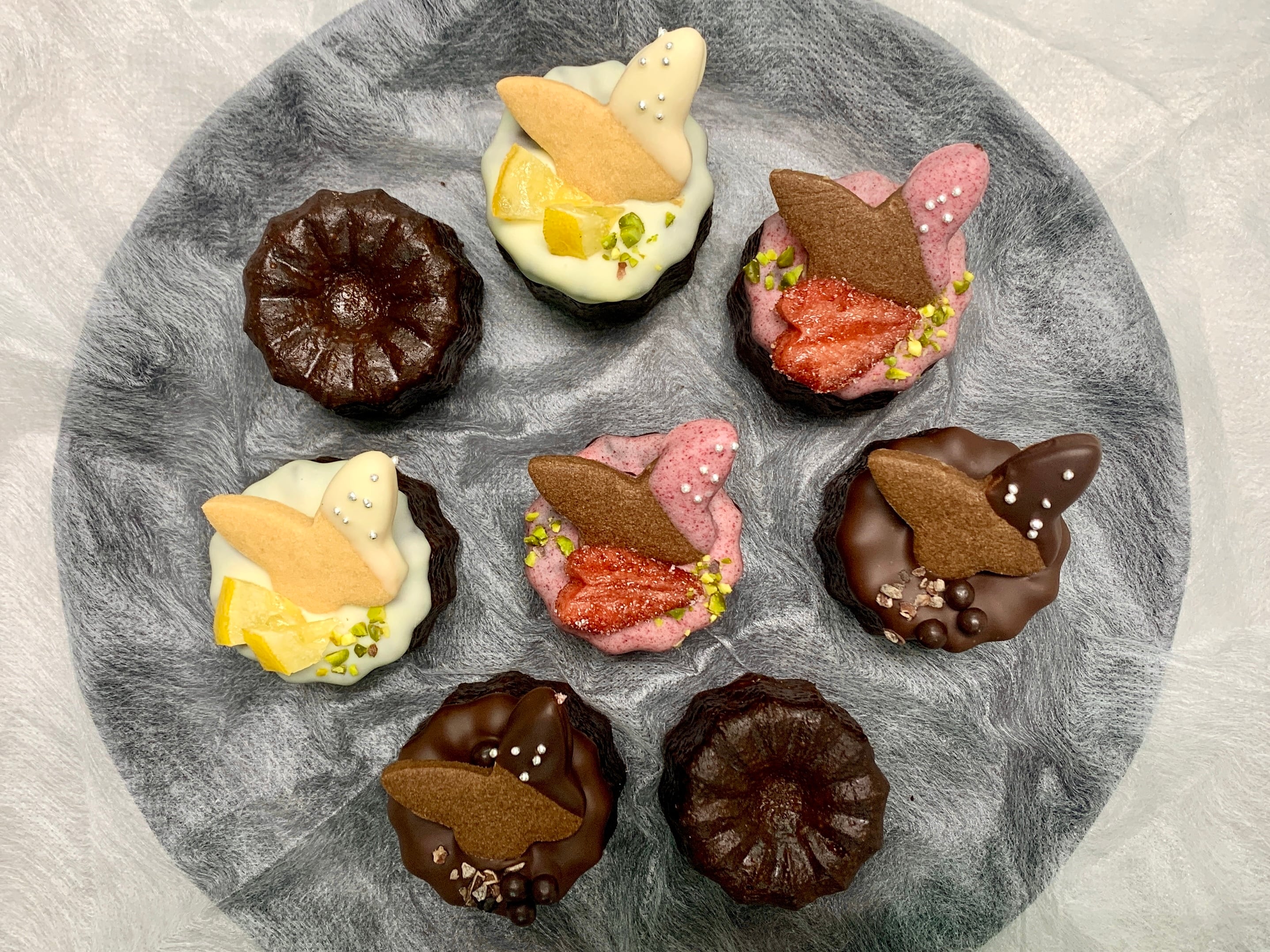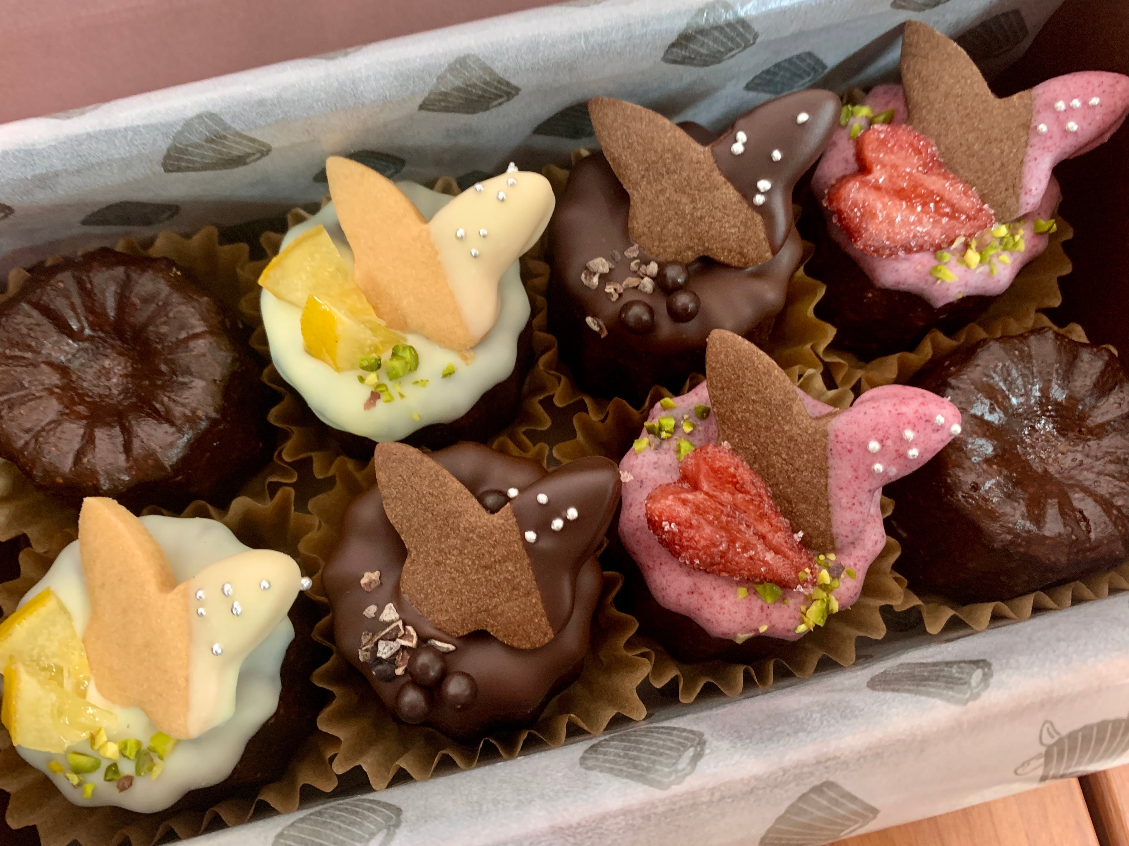 仏ヴァローナ社のビターチョコとラム酒仕込みの濃厚なショコラカヌレ。ビター、木苺、レモンの3種類のチョコをコーティングし、ビターにはカカオニブとパールクラッカン、木苺にはセミドライ苺、レモンにはレモンコンフィと蝶の形の豆乳バタークッキーを添えて愛らしく♪