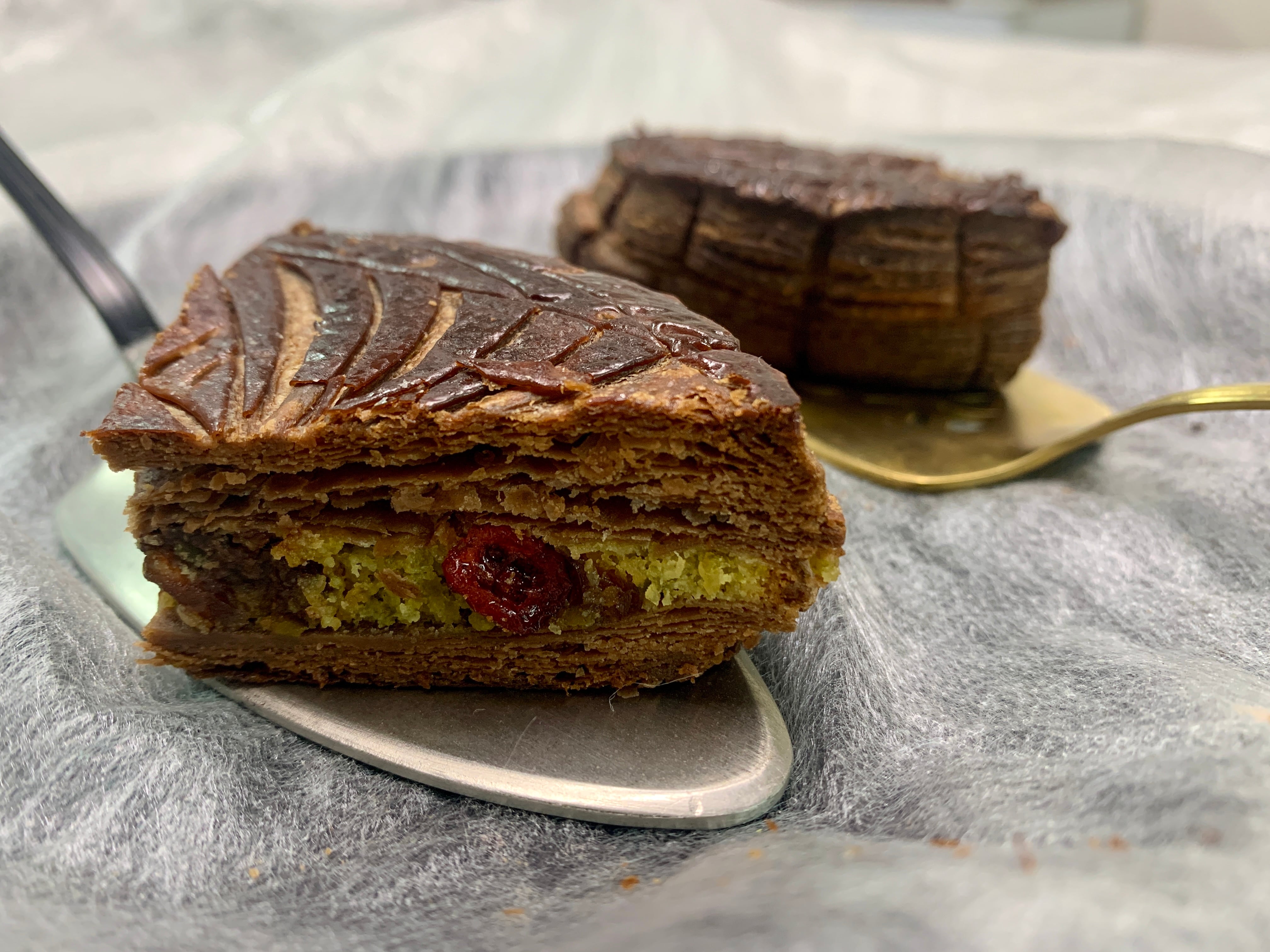 アンヴェルセ配合で144層に折り込んだ香り高いショコラパイ生地に色鮮やかなクレームダマンドピスターシュ、仏ヴァローナ社のビターチョコ、桜リキュール漬けクランベリーを挟みサクサクに焼き上げました。側面にあしらったピスタチオとクランベリーが華やかで特別な日のギフトにも最適です♪
