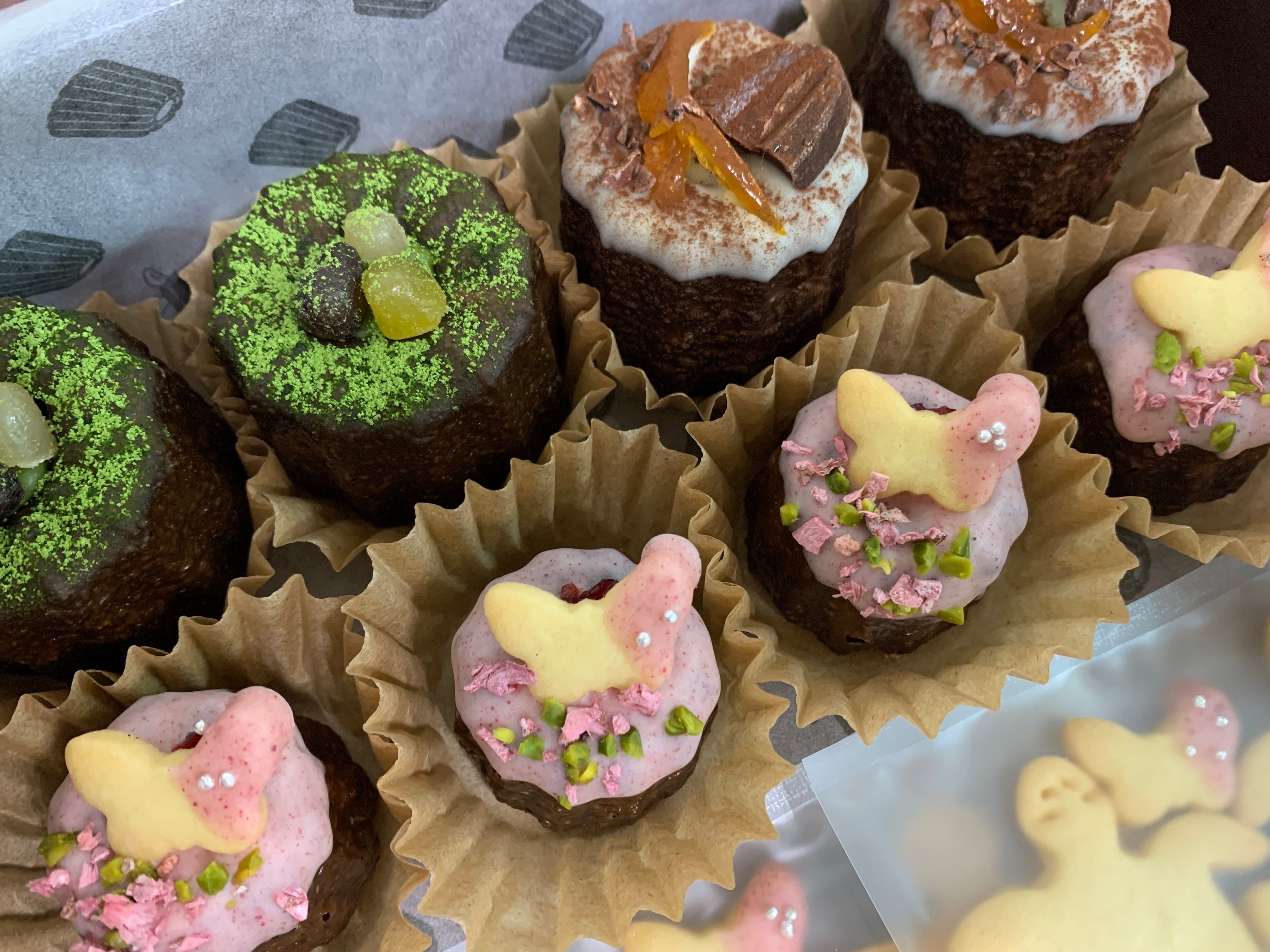 桜リキュール仕込みのカヌレをプチサイズで焼き、桜ベリーチョコと蝶々クッキーをトッピング。一口サイズでも桜の香り漂う可憐なカヌレです。