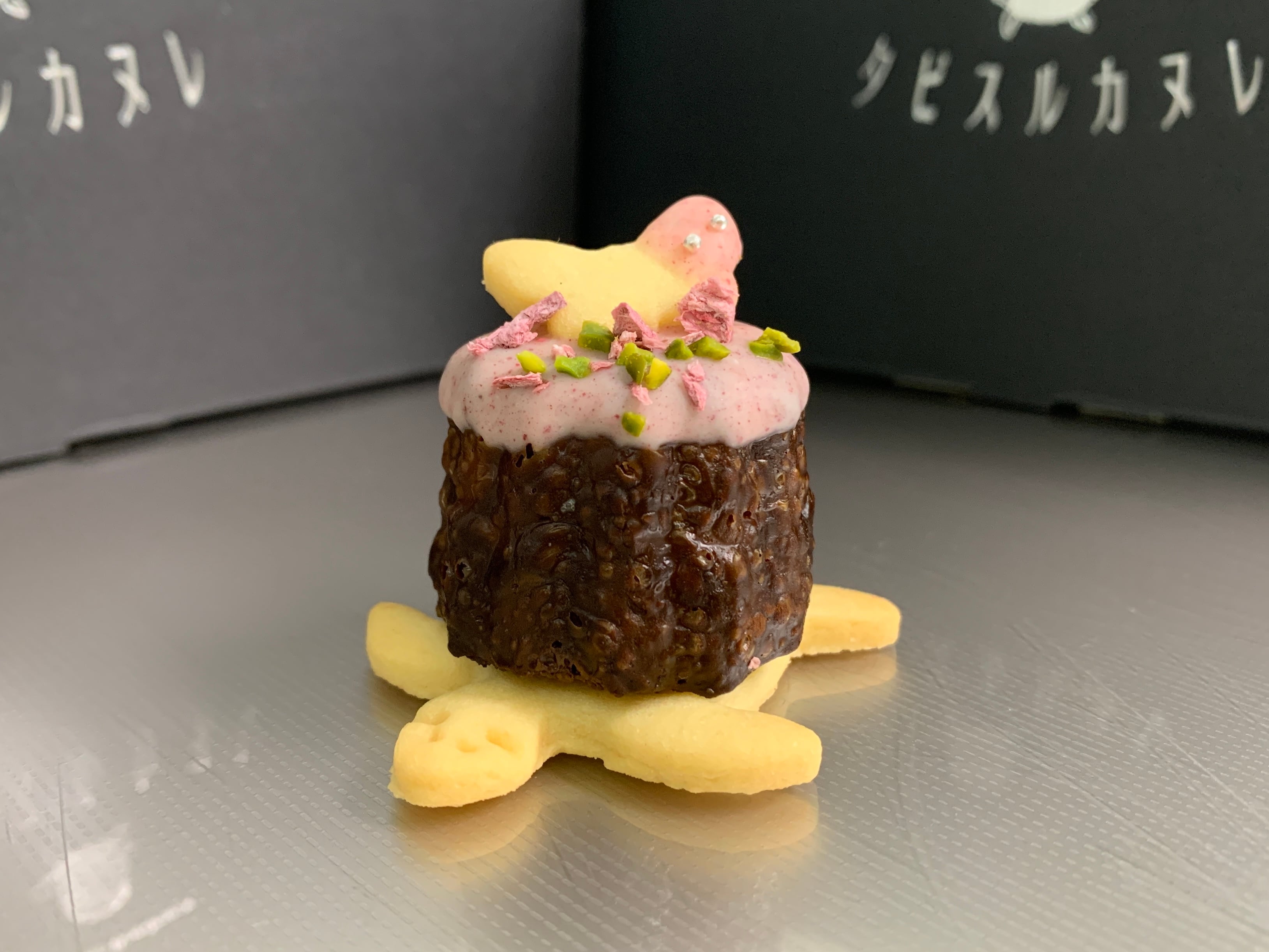 豆乳バターと甜菜糖でお作りする優しい甘さのクッキー。桜ベリーのプチカヌレ乗せてタビスルカヌレの看板カメ「カメレ」をお好きな角度で楽しんでくださいね。